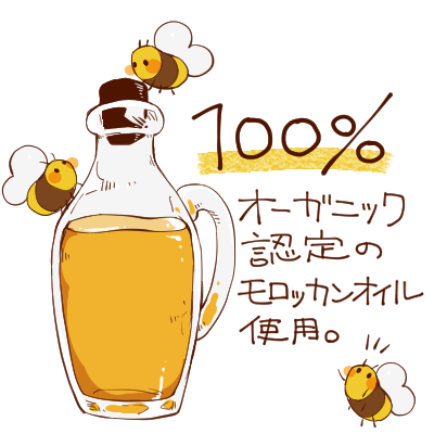 髪にピュアなうるおいを与える、100%オーガニック認定のモロッカンオイルを贅沢に使用しています。髪と地肌のことを考えた優しくうるおう成分にこだわり、ナチュラル処方を追求しました。