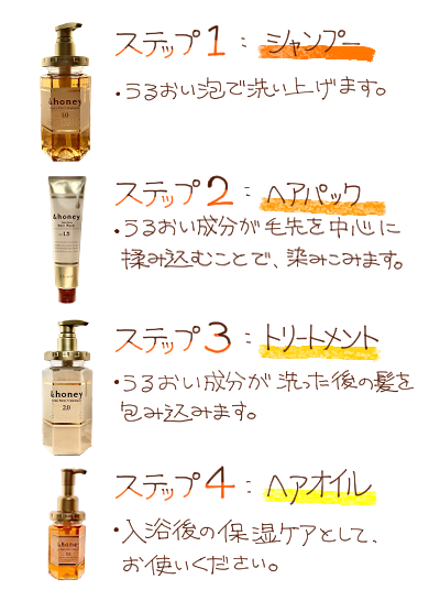 シャンプー・ヘアパック・トリートメント・ヘアオイルと、一つ一つケアを重ねていくたびに髪が美しく仕上がっていく変化も楽しめます。