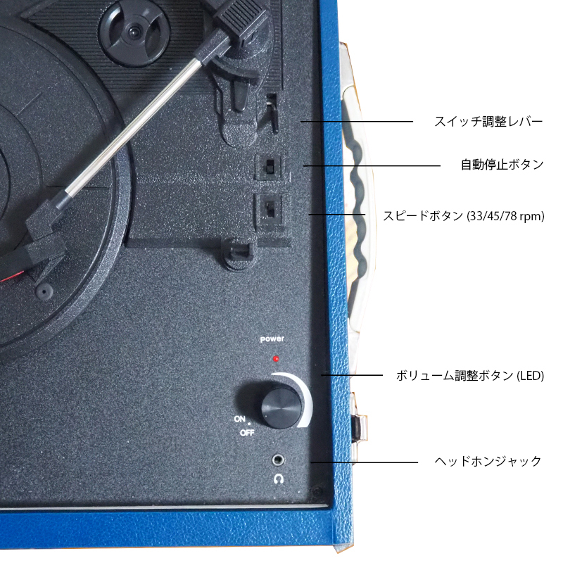 回転数は33-1/3、45、78回転に対応です。 7、10、12インチのレコードが再生できます。