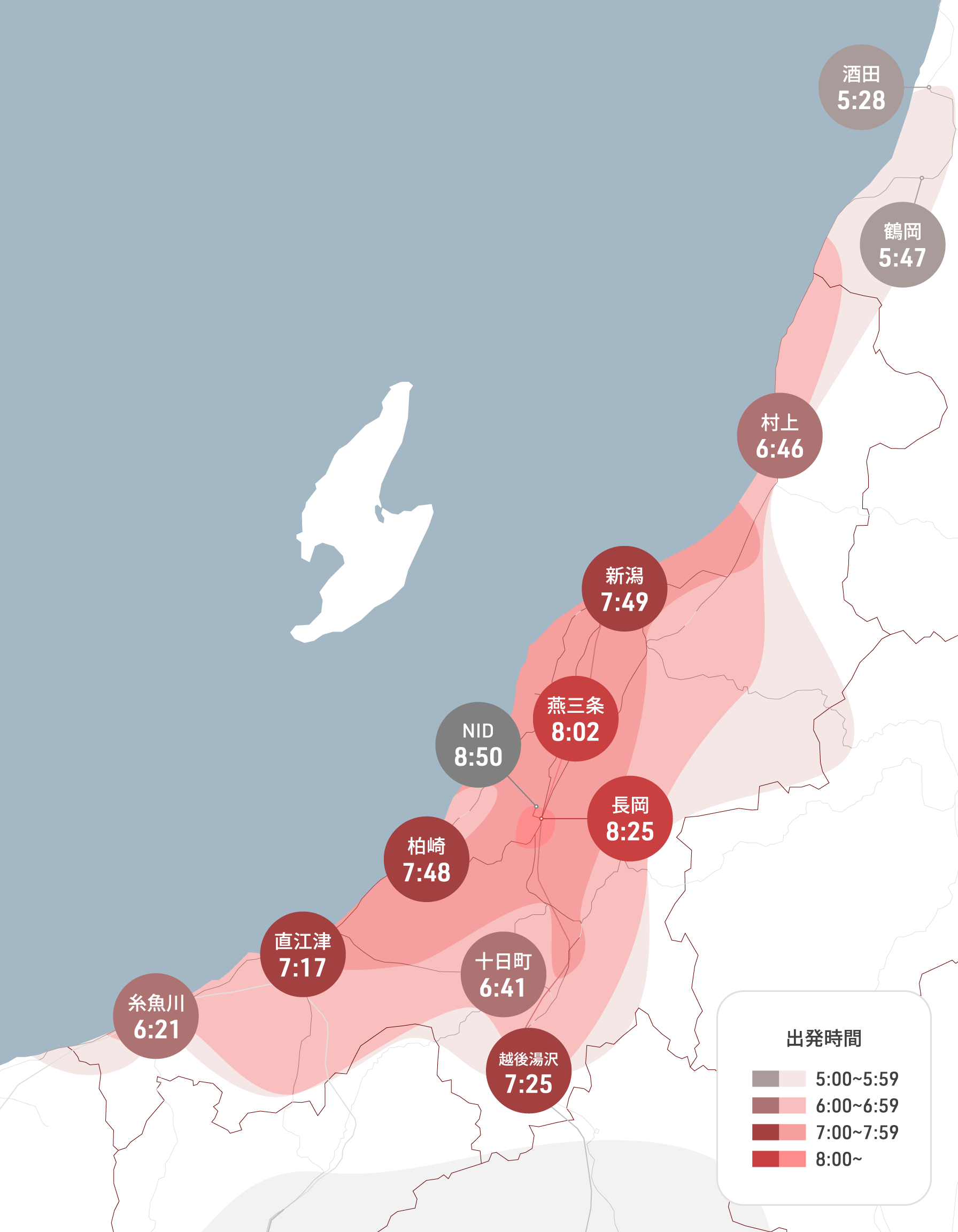 新潟県内全域や長野、関東、山形の庄内から間に合います。新幹線は6時にならないと出発できないため、北陸の各都市からは間に合いません。